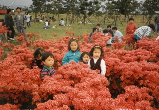 빨간 연산홍 꽃밭에서.  봄이면 아이들과 나들이 나와 사진 찍던 명소가 되어 주었다.