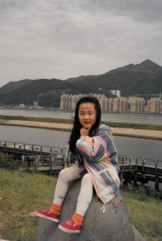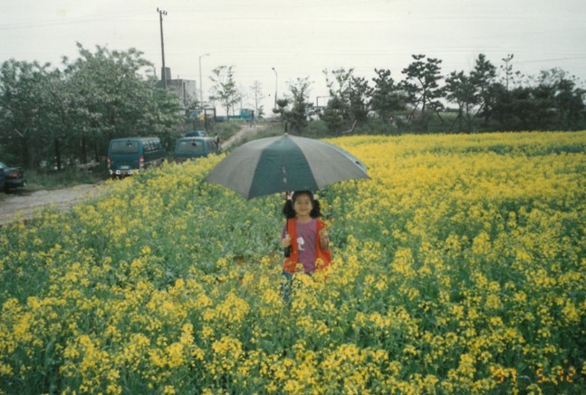 노오란 유채꽃밭에서 커다란 우산을 쓴 딸아이.